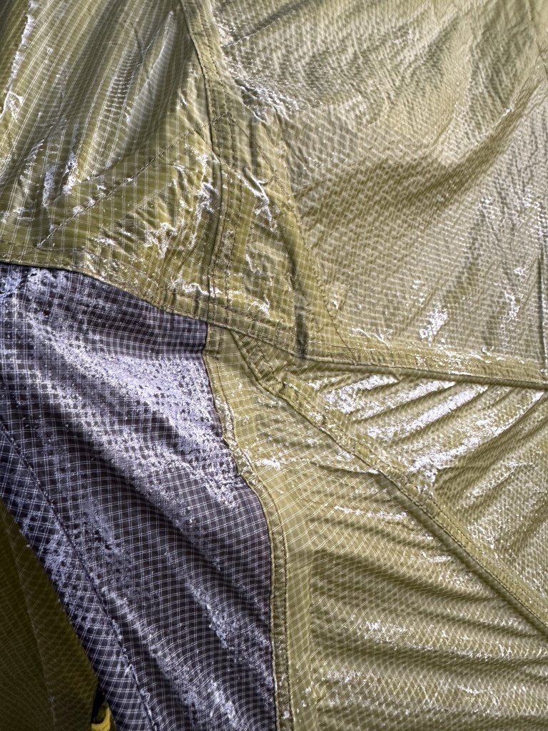 My tent was frosted over but the cold wasn’t unbearable. I felt pretty well equipped from a clothing and shelter standpoint, despite not expecting temperatures to drop that low.